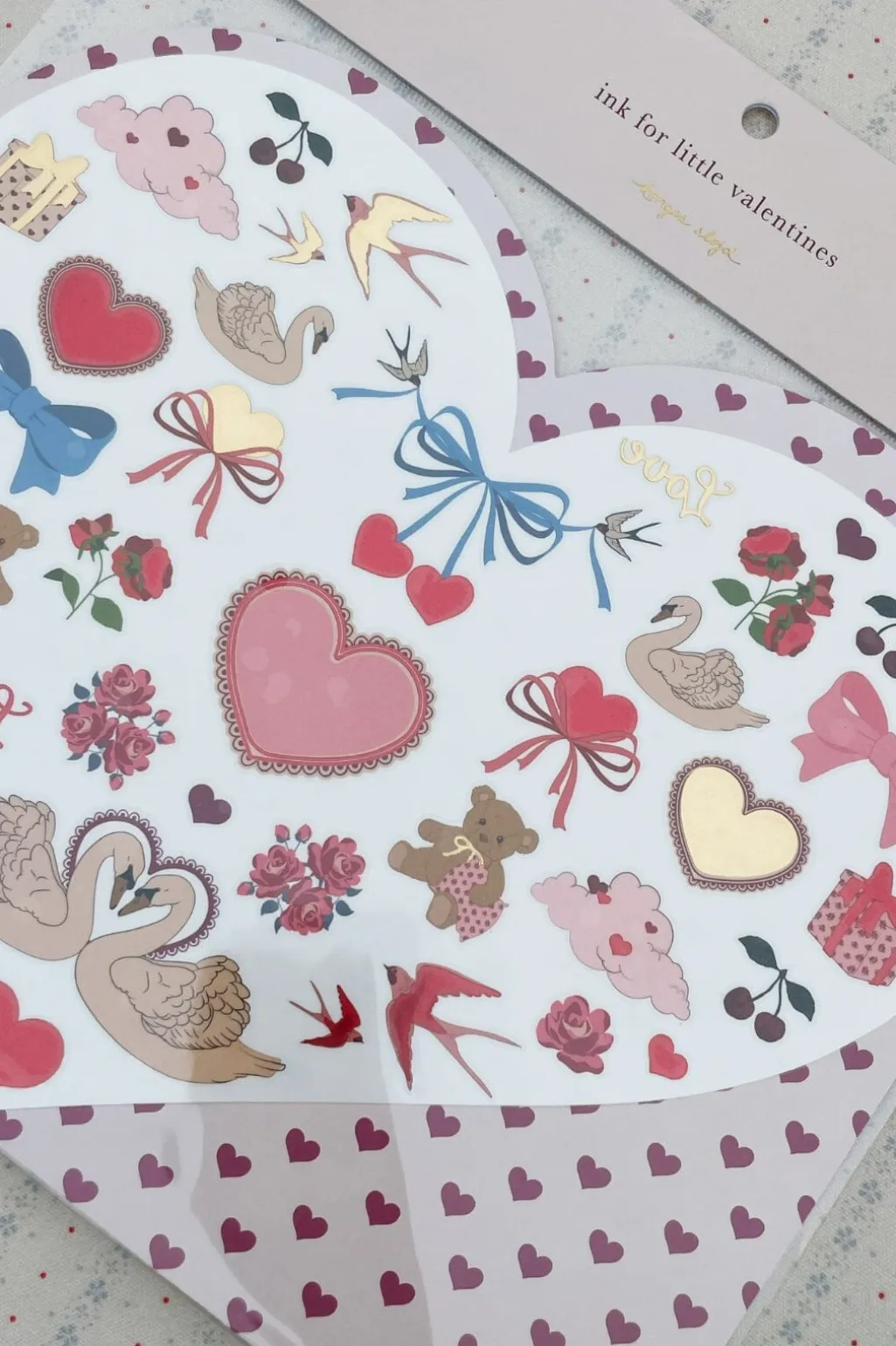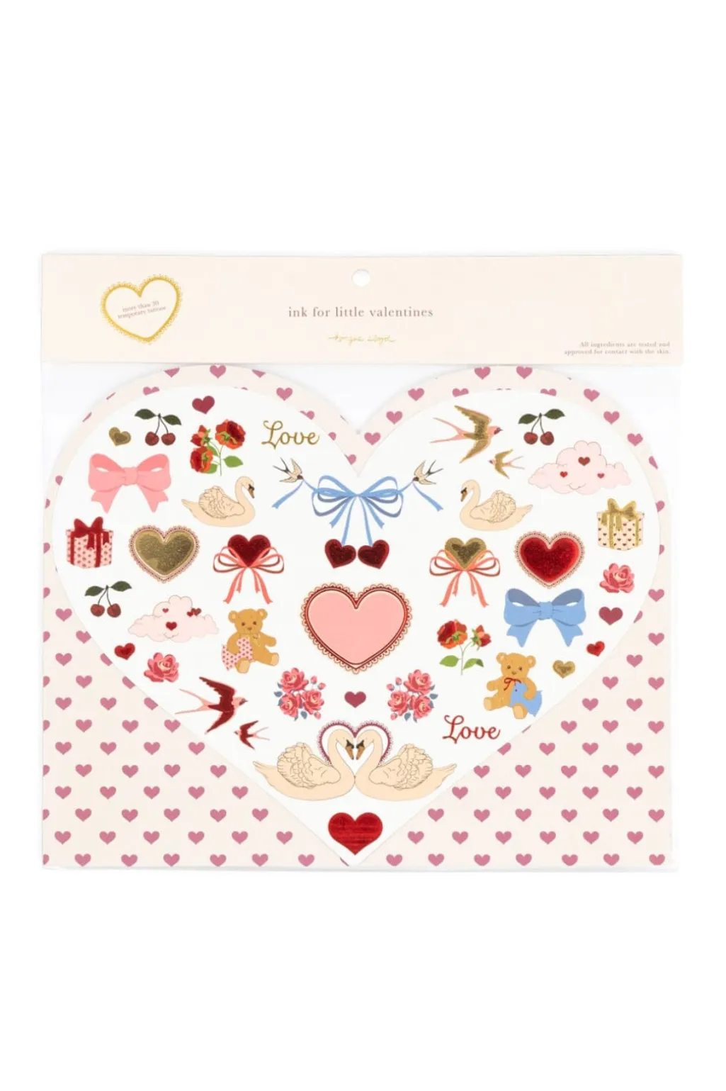 Midlertidige tatoveringer fra Konges Sløjd med hjerter, svaner, blomster og bamser i forskellige farver. Tatoveringerne har et valentinsdagstema og er nemme at påføre og fjerne igen.
