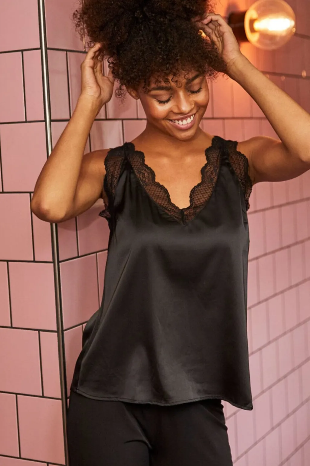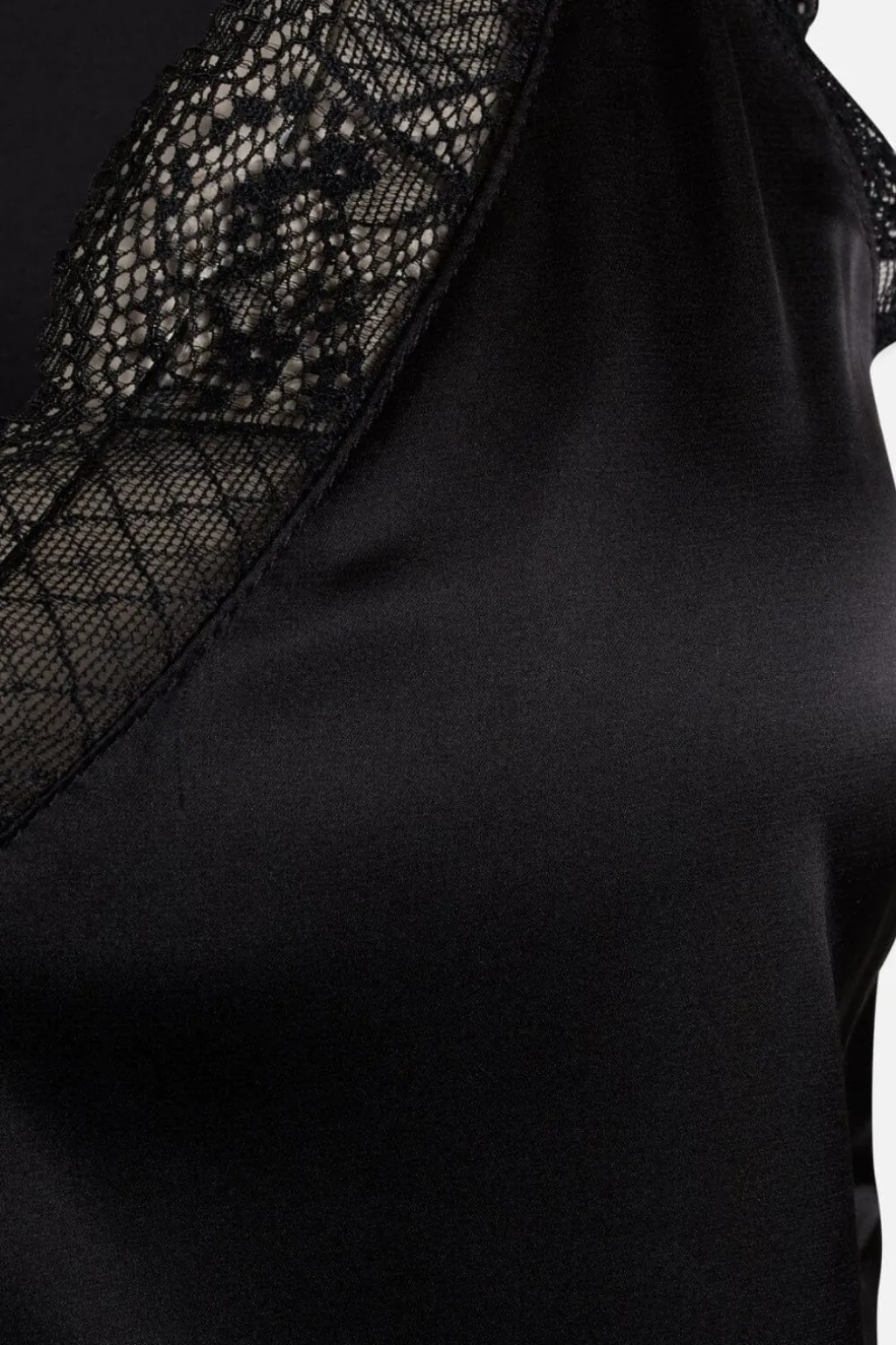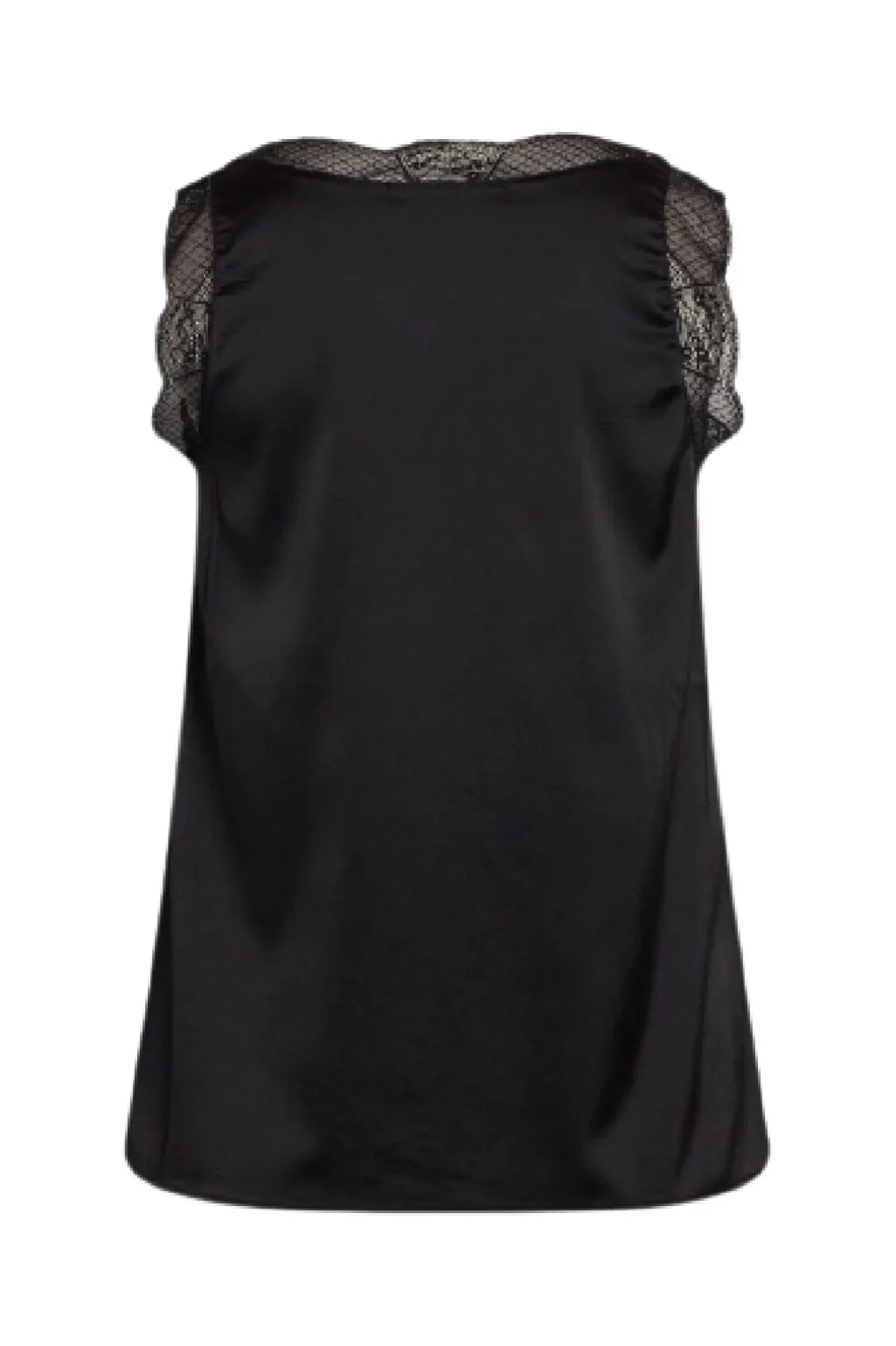 Sort top fra Sisters Point i satinmateriale med blondedetaljer ved V-udskæringen. Toppen har en blød overflade og kan styles alene eller med en t-shirt under.
