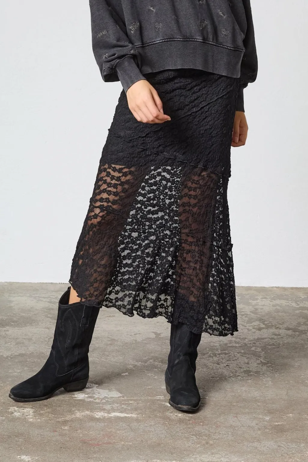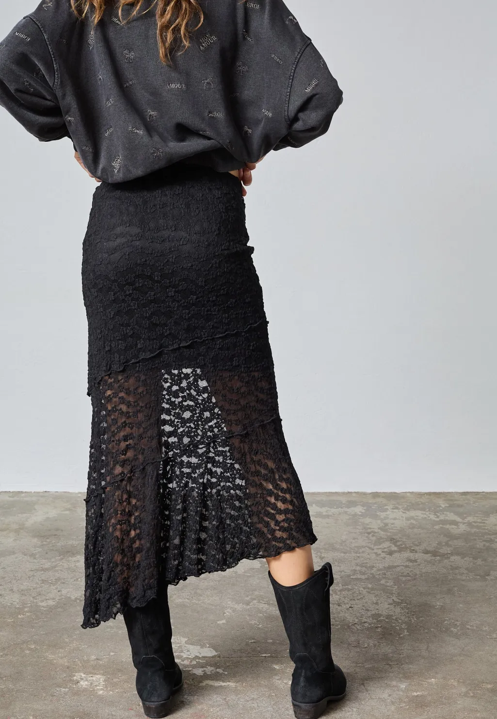 Sort nederdel fra Sisters Point, lavet af transparent blonde-materiale med et blomstermønster. Nederdelen har indre for og flæsekant forneden.