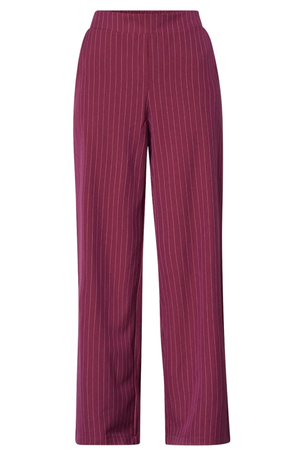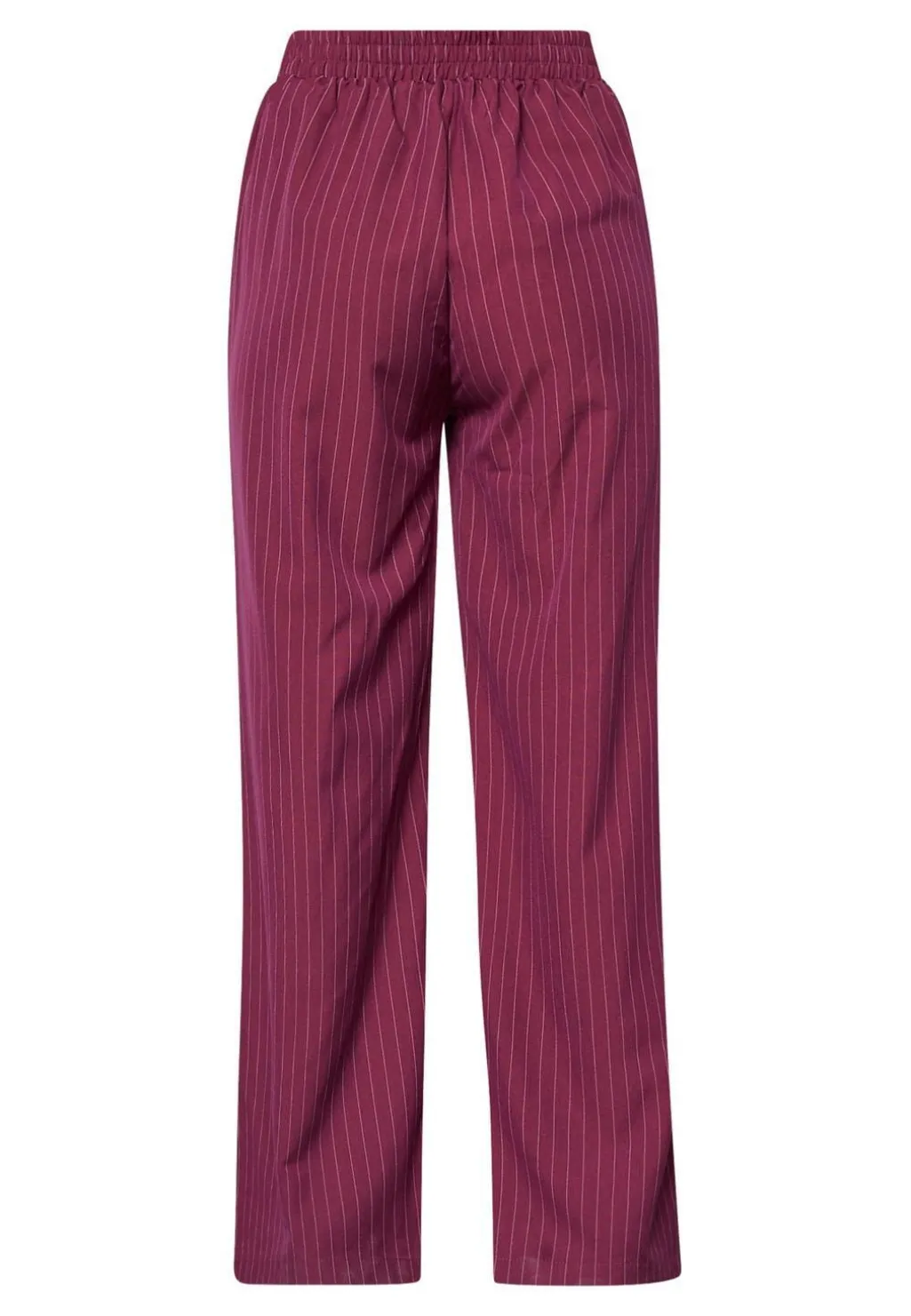 Buks fra Sisters Point i bordeaux og creme med lodrette nålestriber. Bukserne har en løs pasform, gulvlængde og en elastisk talje.