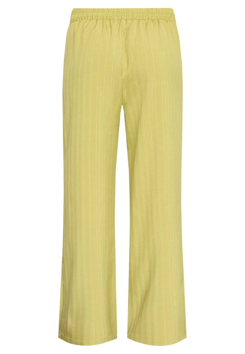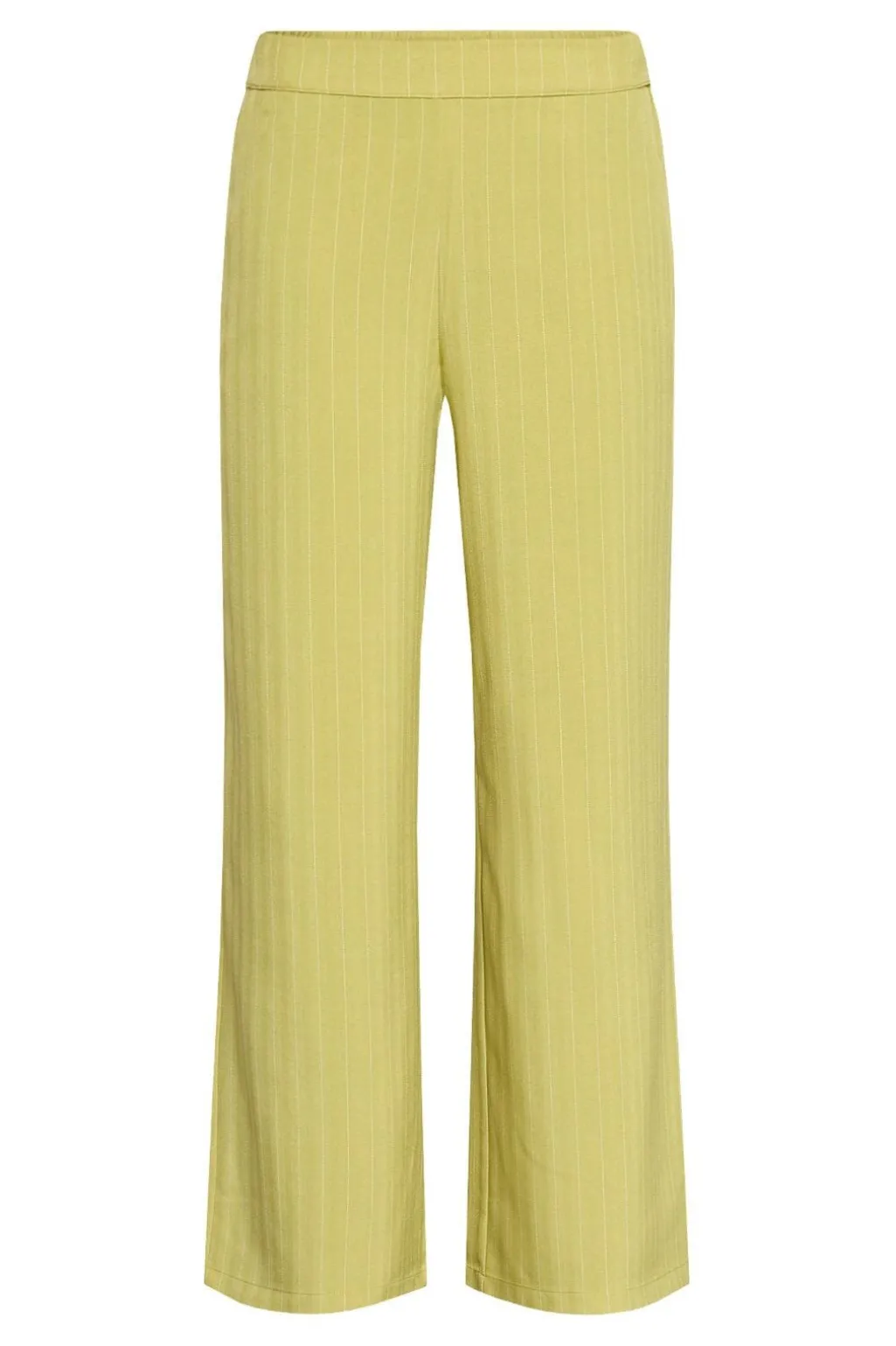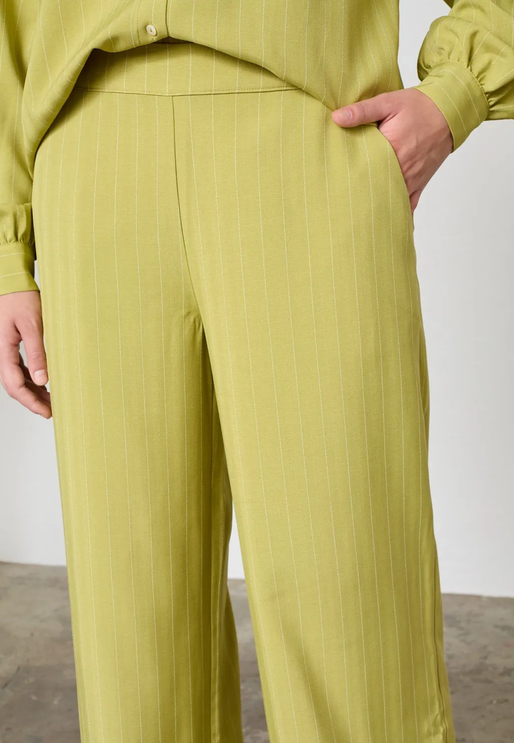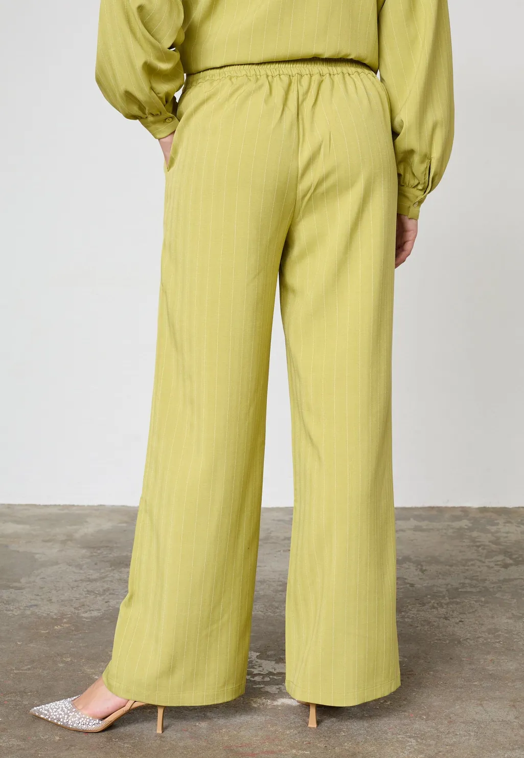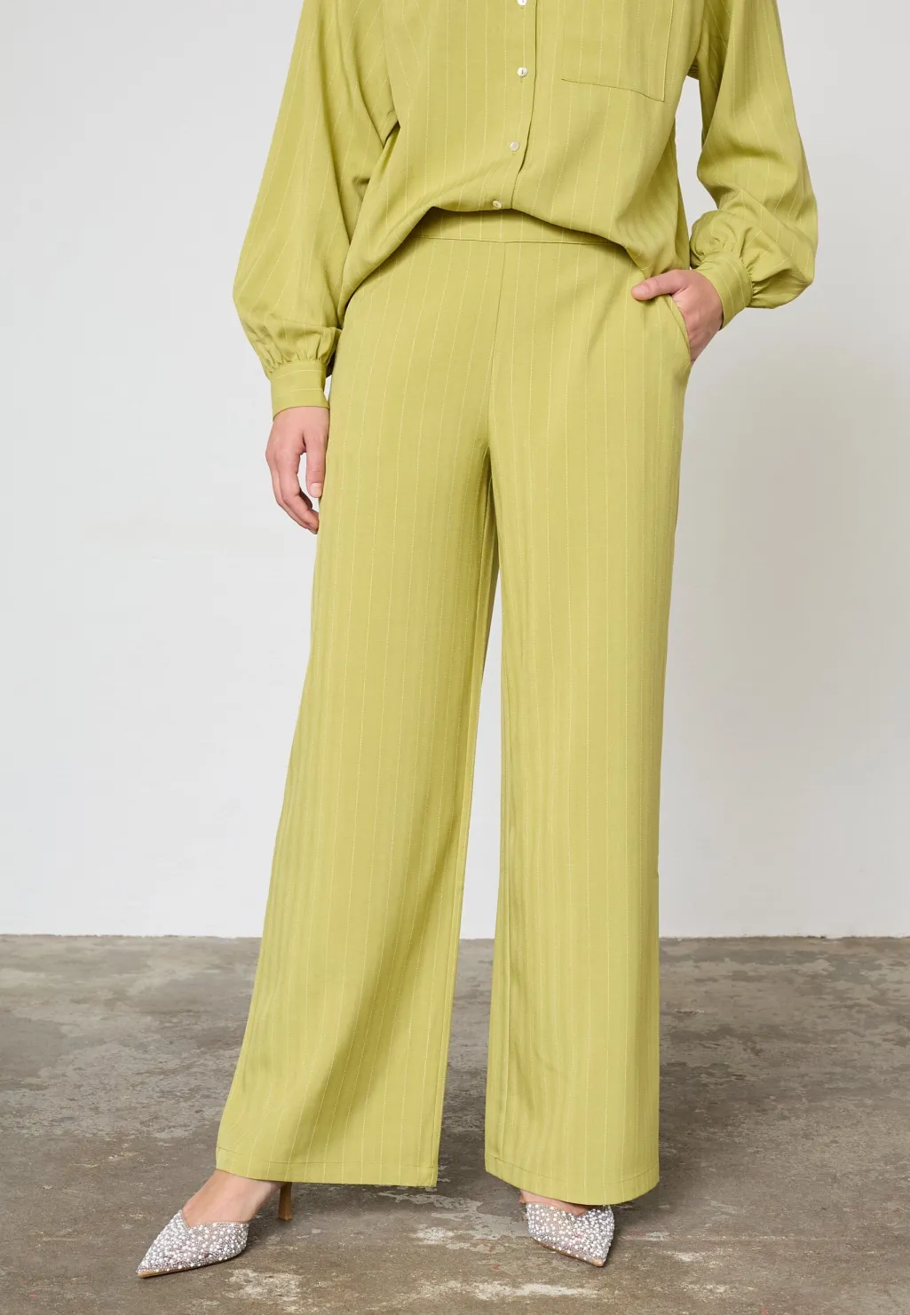 Limefarvede habitbukser fra Sisters Point med tynde striber i lodret pinstripe-mønster. Bukserne har brede, lige ben og en høj talje med elastisk kant.