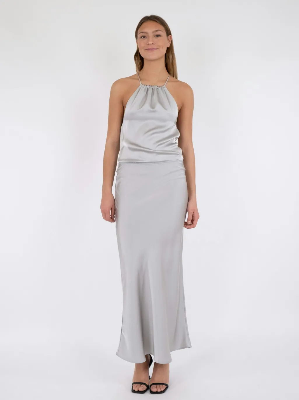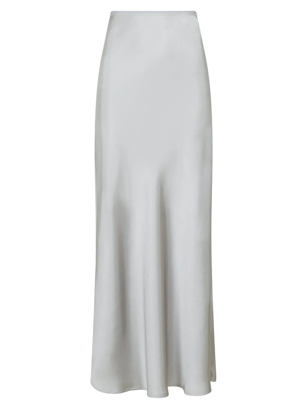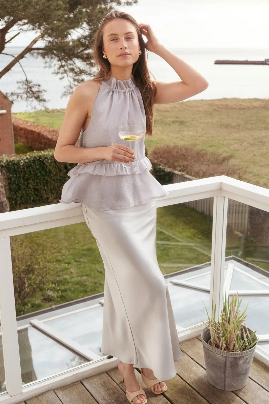 Lang sølvfarvet nederdel fra Neo Noir i blødt satin. Nederdelen har skrå snit og flæser, der giver bevægelse til designet. Den indvendige elastik i taljen sikrer en behagelig pasform.
