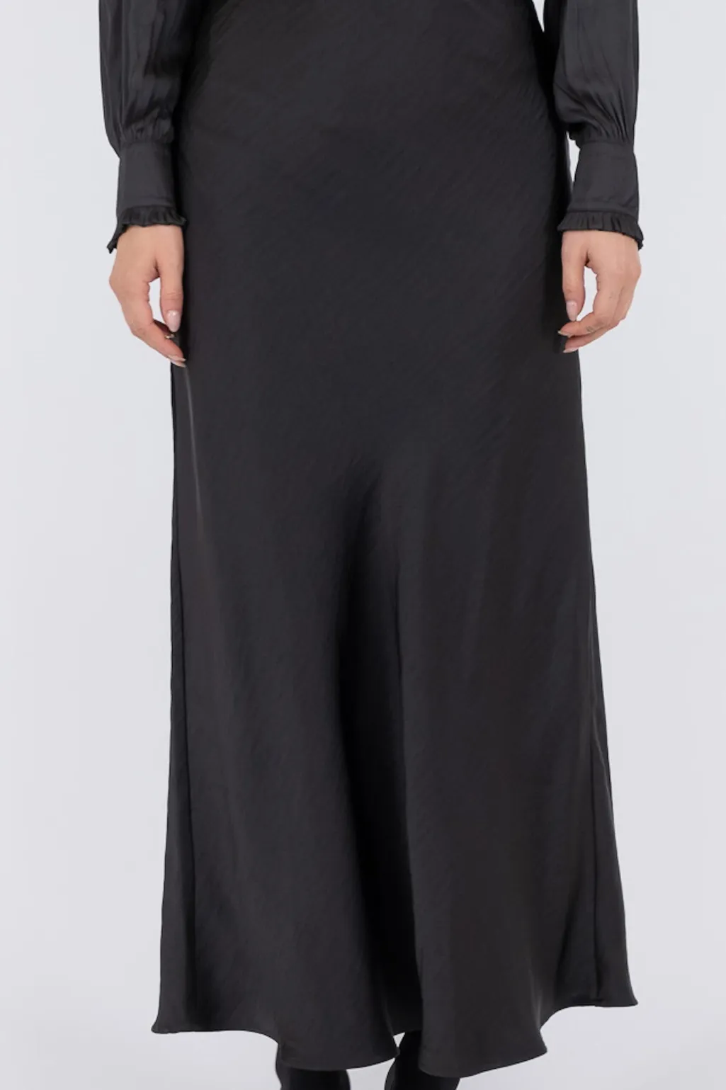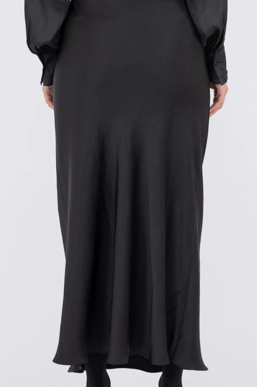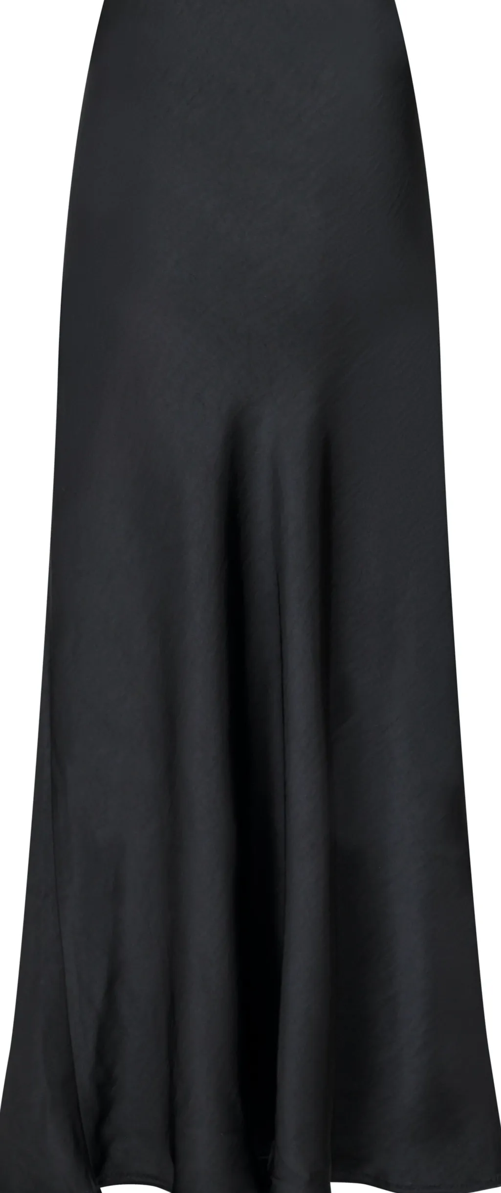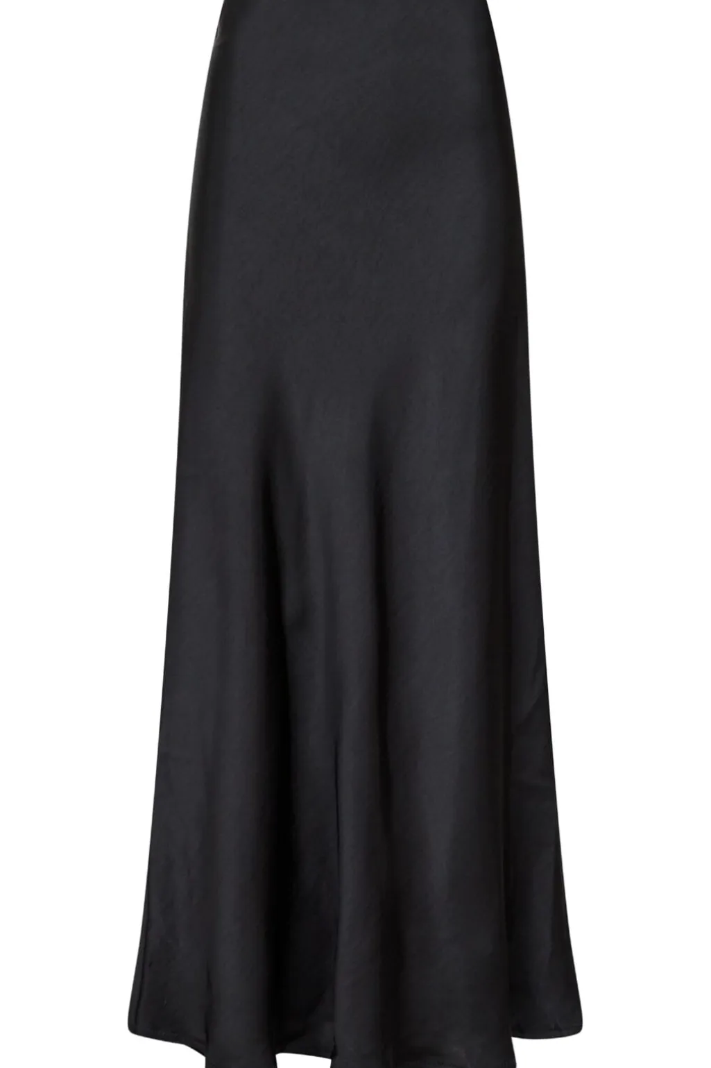 Sort nederdel i blødsatin med skinnende overflade. Den skrå skæring og ankellængde giver et flot fald, mens den lave talje og slim fit-pasform følger kroppens form.