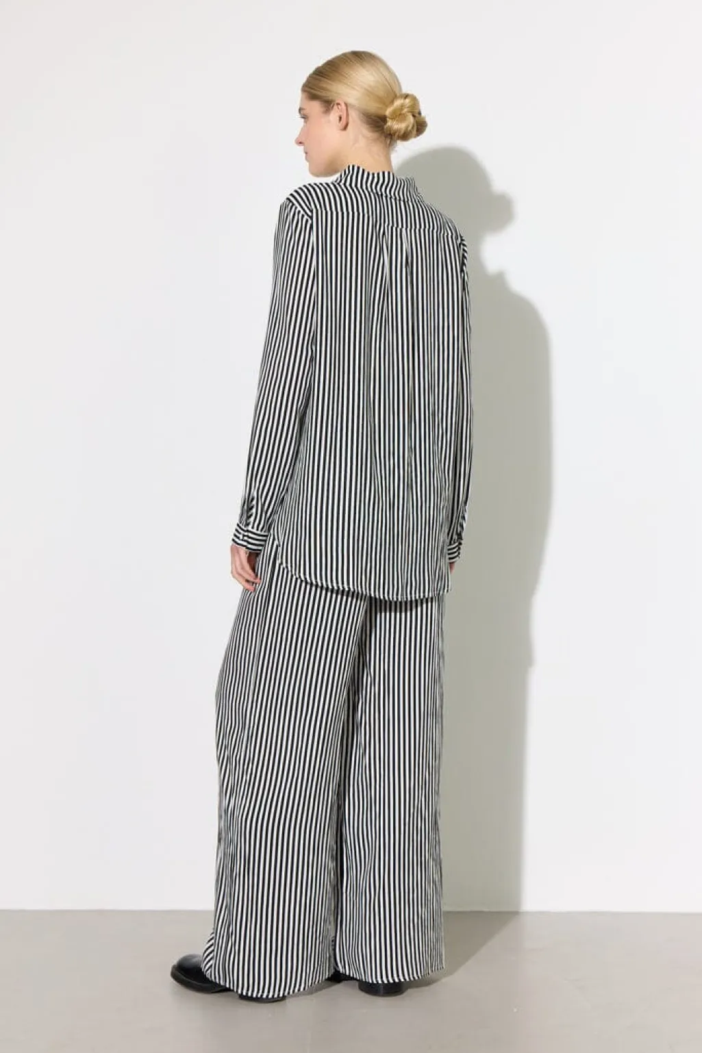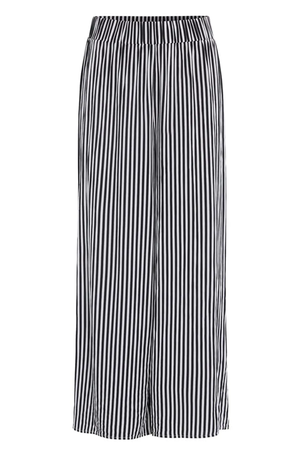 Stribede bukser fra Hunkøn, lavet af 100 % viskose. Bukserne har sorte og hvide vertikale striber og en løs pasform.