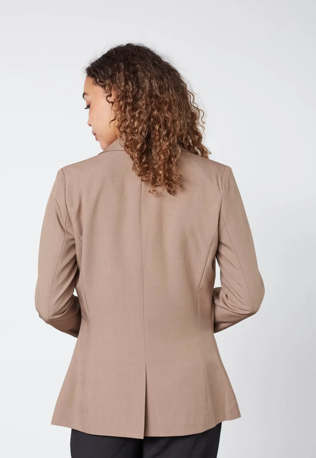Beige blazer fra Sisters Point med skjortekrave og enkelt knaplukning. Blazeren har et figursyet snit og lange ærmer med dekorative knapper.