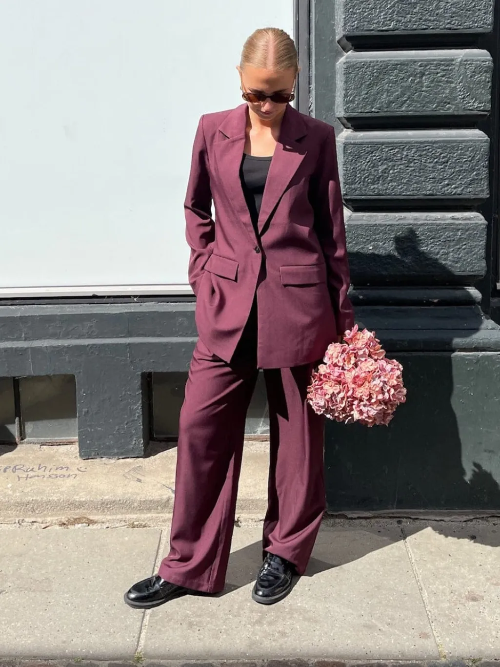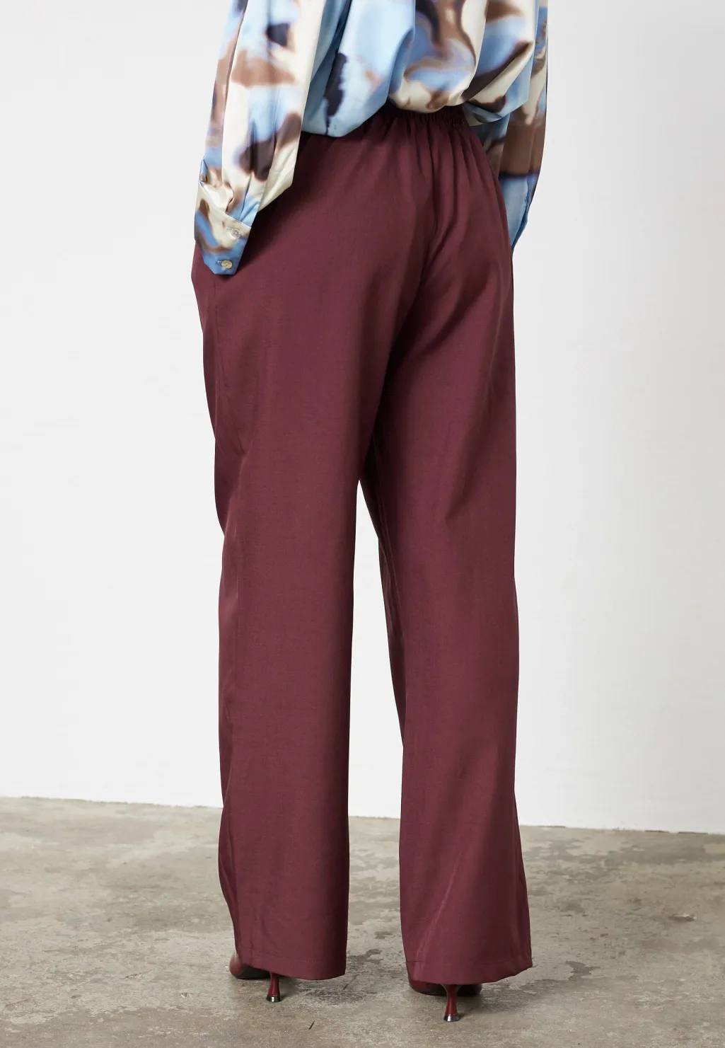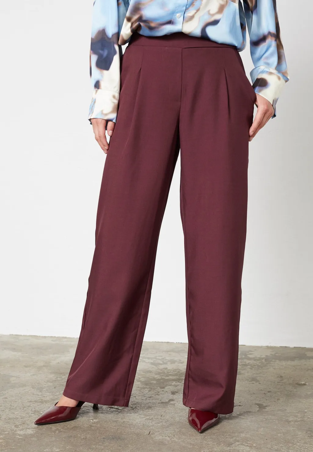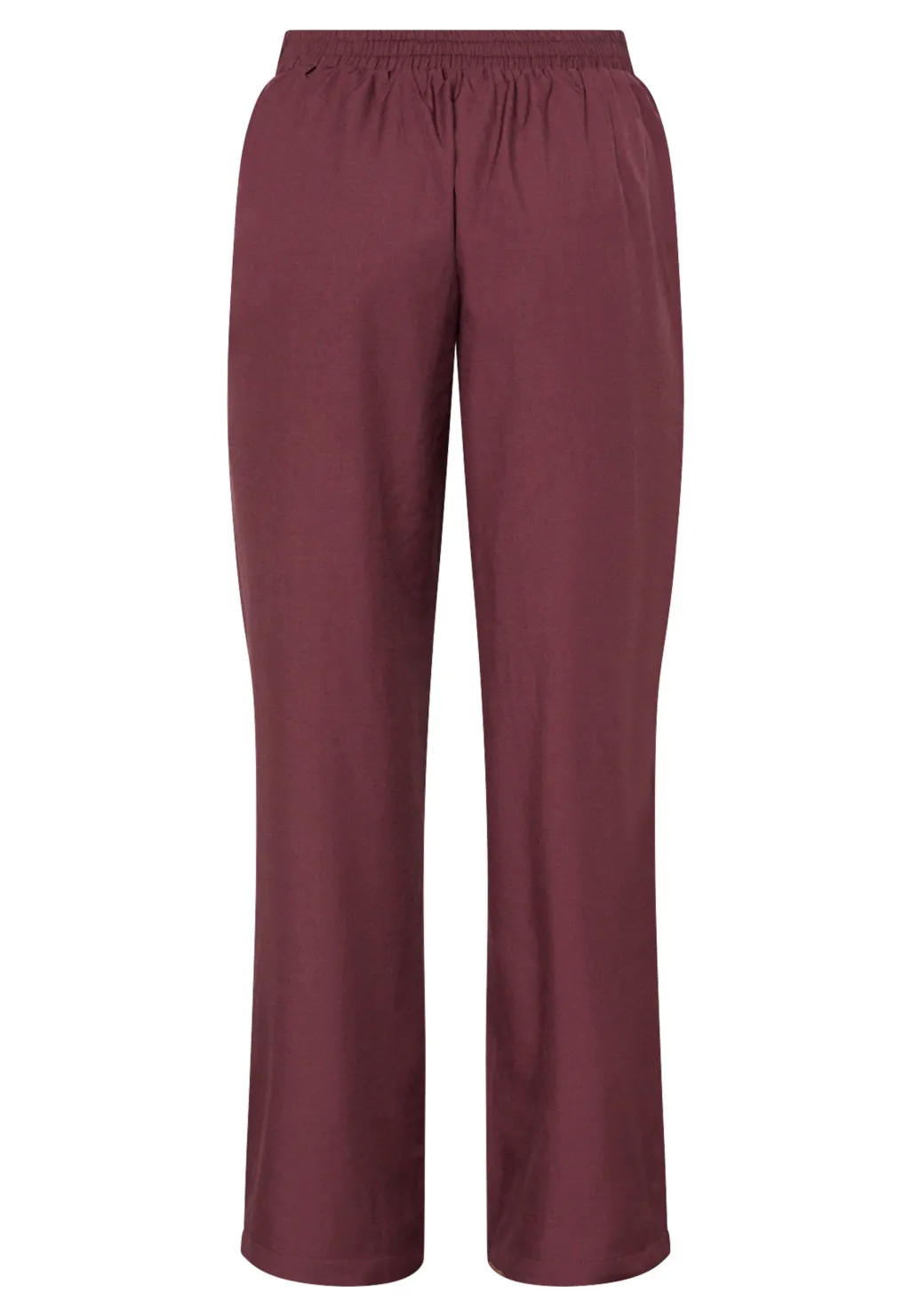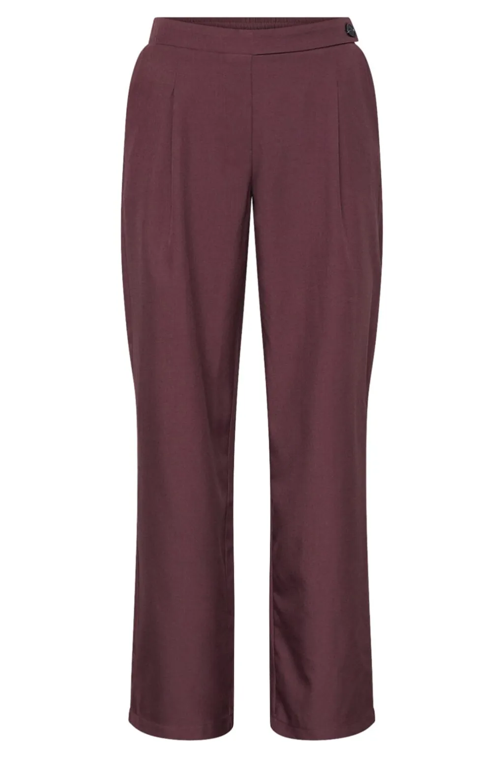 Bukser fra Sisters Point i dyb bordeaux. Bukserne har høj talje, løs pasform og vide ben med pressefolder foran.