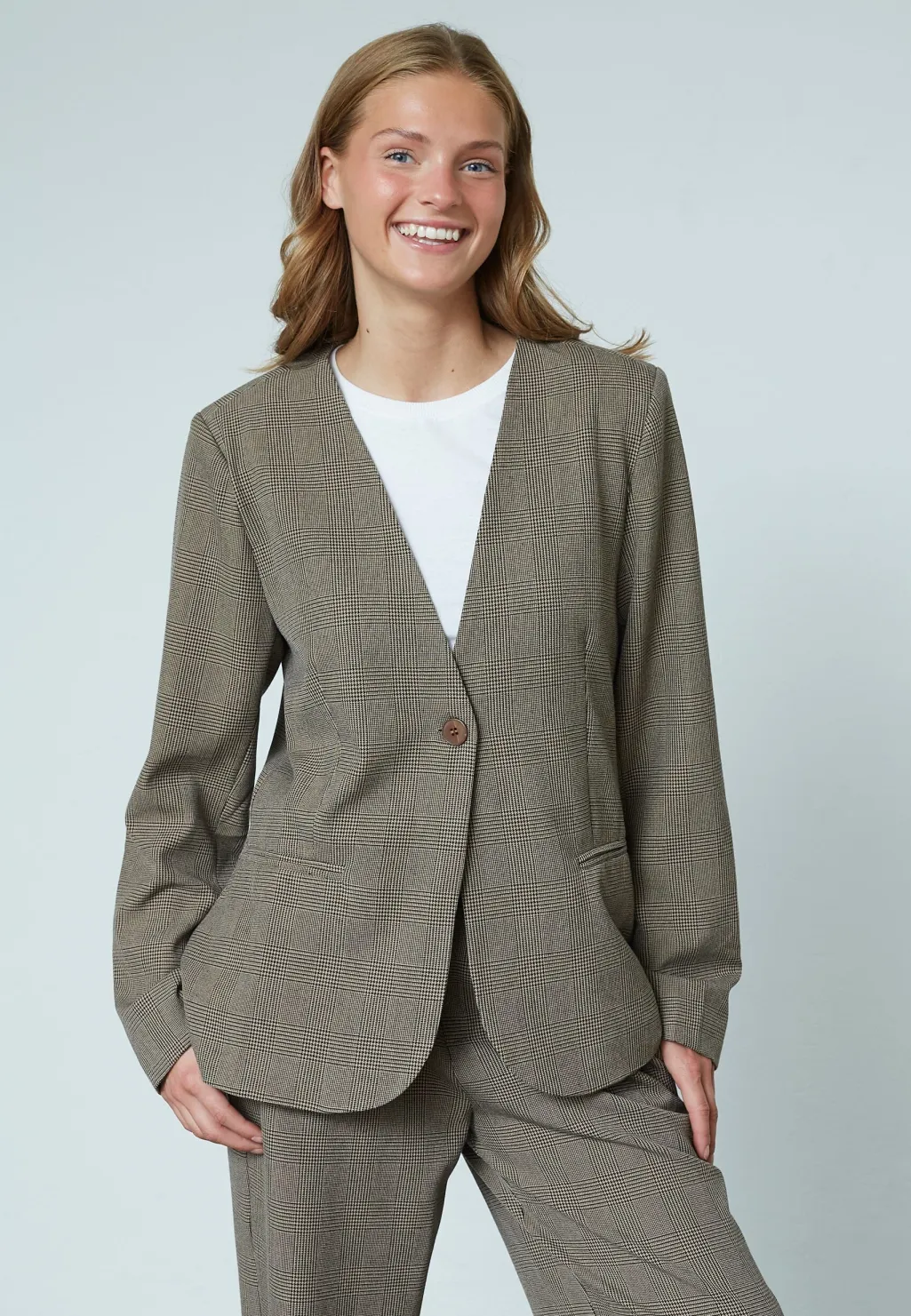 Ternet blazer fra Sisters Point i brune og beige nuancer. Blazeren har et tydeligt ternet mønster og en enkelt knaplukning foran.
