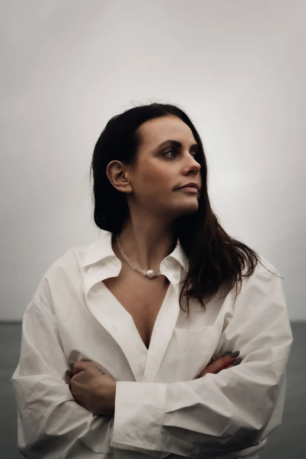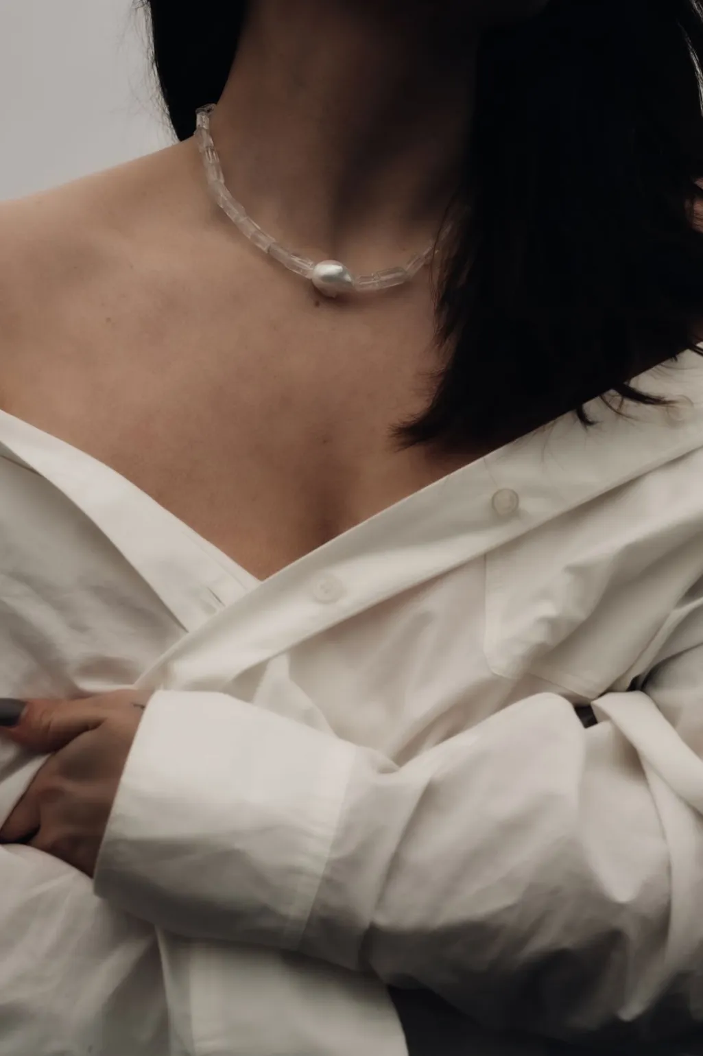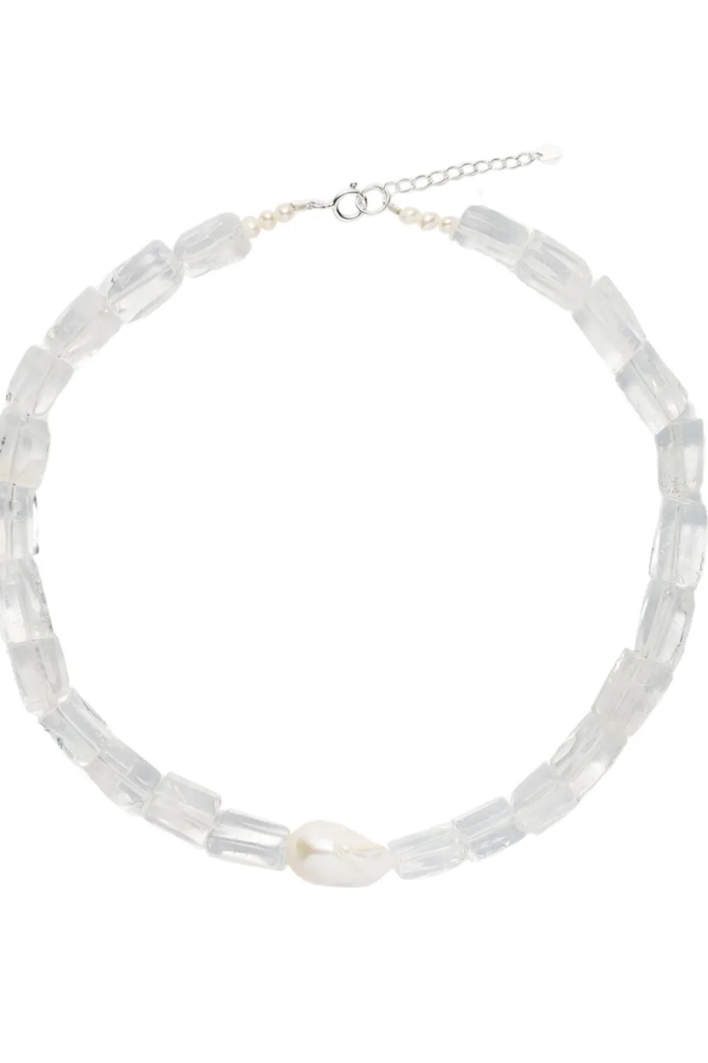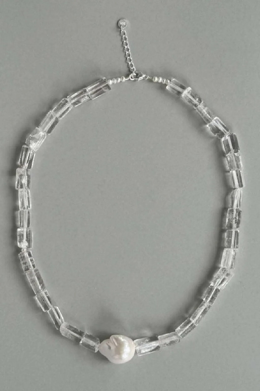 Håndlavet halskæde fra Sorelle Jewellery i sterling sølv med firkantede bjergkrystaller og en DNA-barok ferskvandsperle i midten.