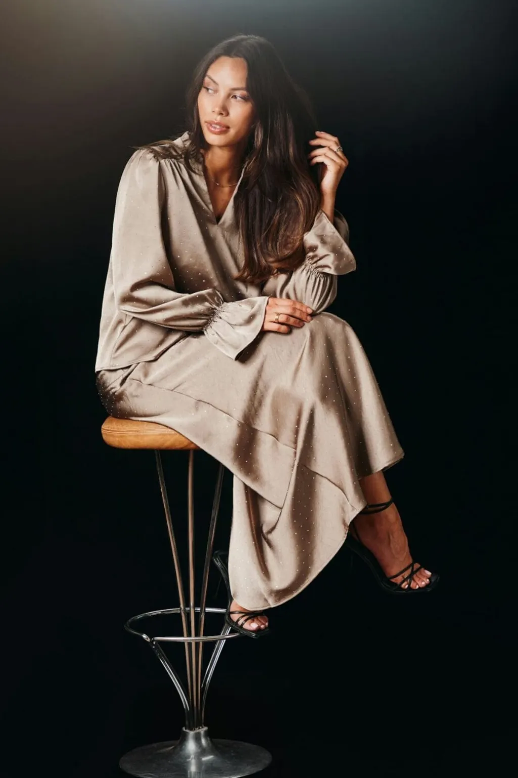 Lang nederdel fra Neo Noir i brun-grå satin med små pailletter fordelt i et prikkemønster over hele nederdelen.