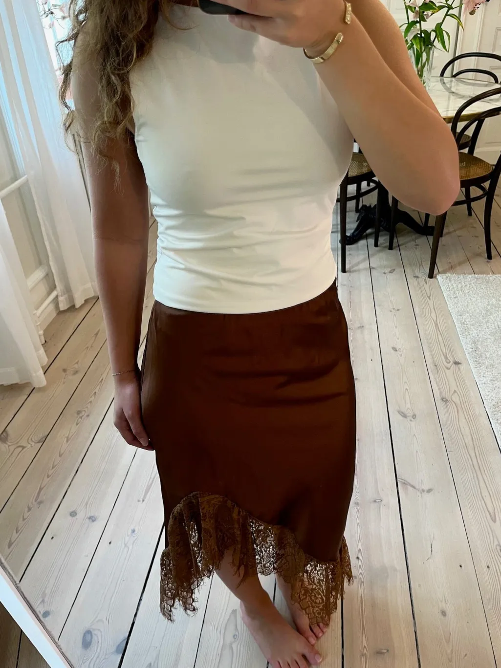 Brun nederdel fra A-bee, lavet af 100 % polyester. Nederdelen har en asymmetrisk kant med blondedetaljer og en tætsiddende pasform.