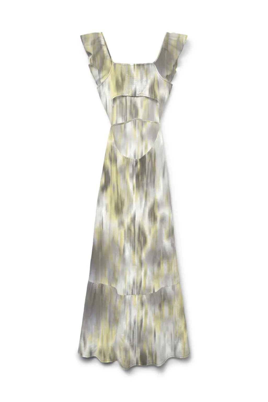 Lang kjole fra Vero Moda med multifarvet print i grå og hvide nuancer. Kjolen har V-hals, flæsedetaljer og et ærmeløst design med en regular pasform.