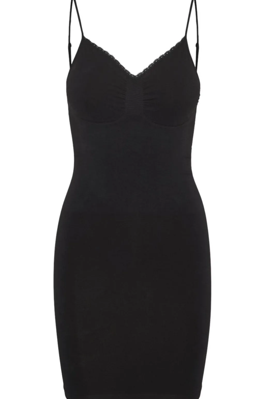 Sort shapewear-kjole fra Vero Moda med tætsiddende silhuet. Kjolen har blondedetaljer ved V-udskæringen og en dyb ryg med formgivende effekt i maveområdet.
