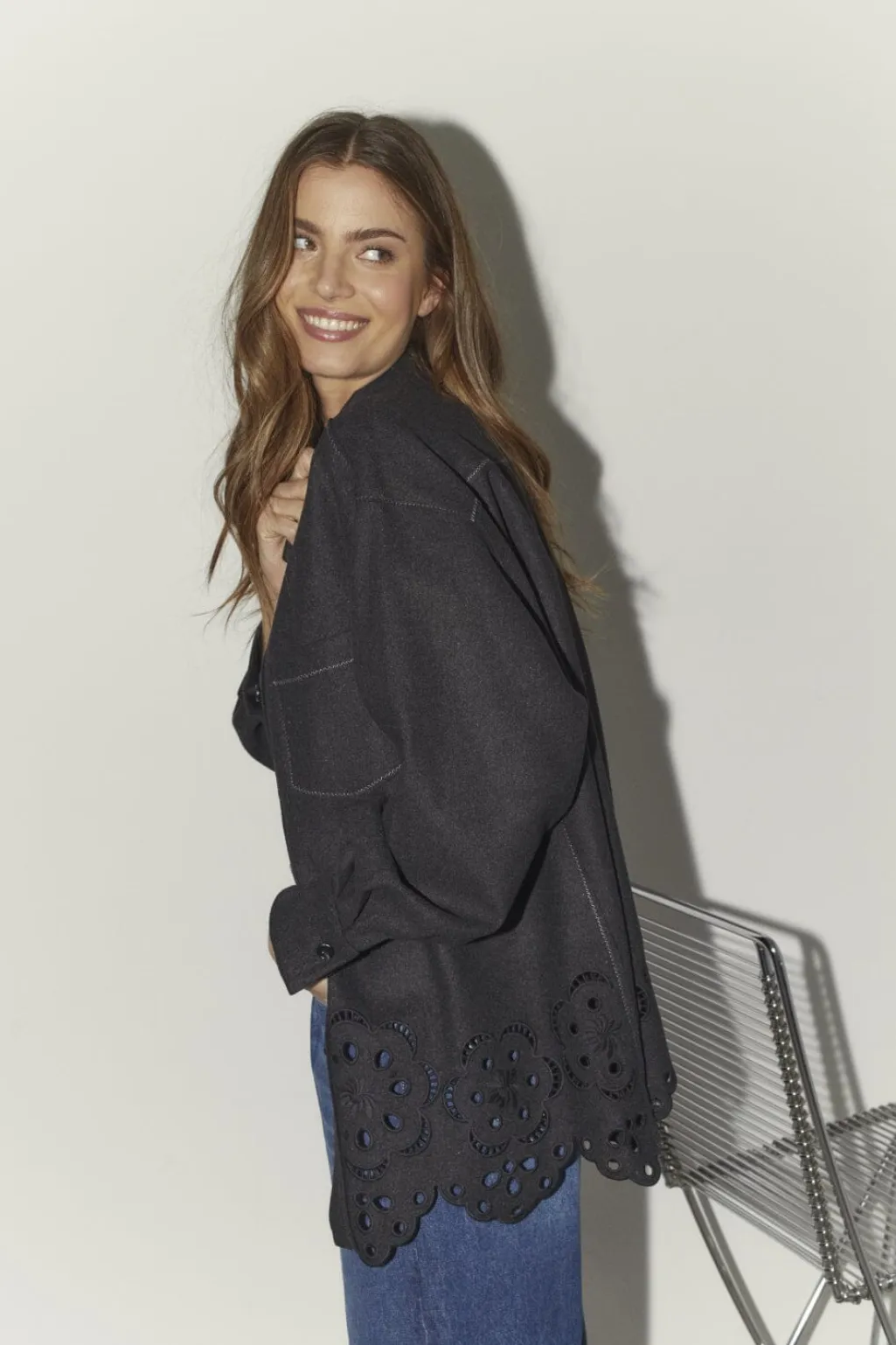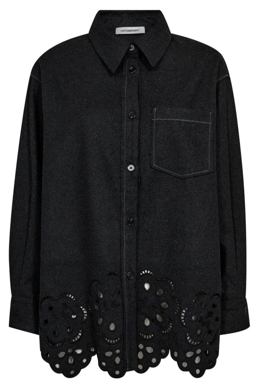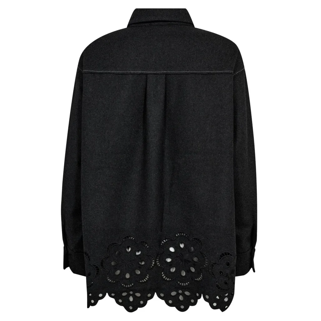 Mørkegrå skjorte fra Co´Couture, lavet af en blanding af polyester og uld. Skjorten har broderi langs bunden og en oversized pasform.