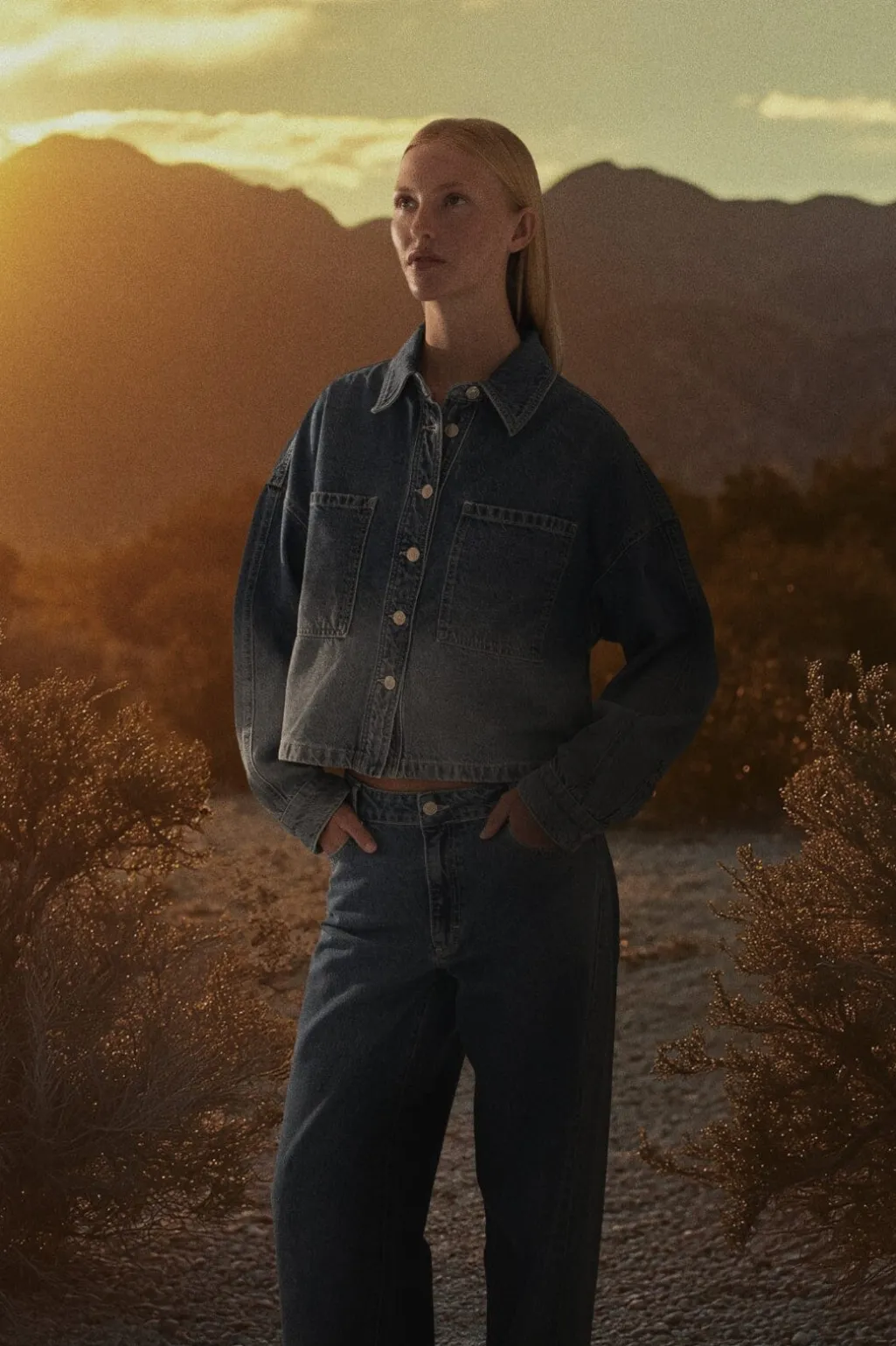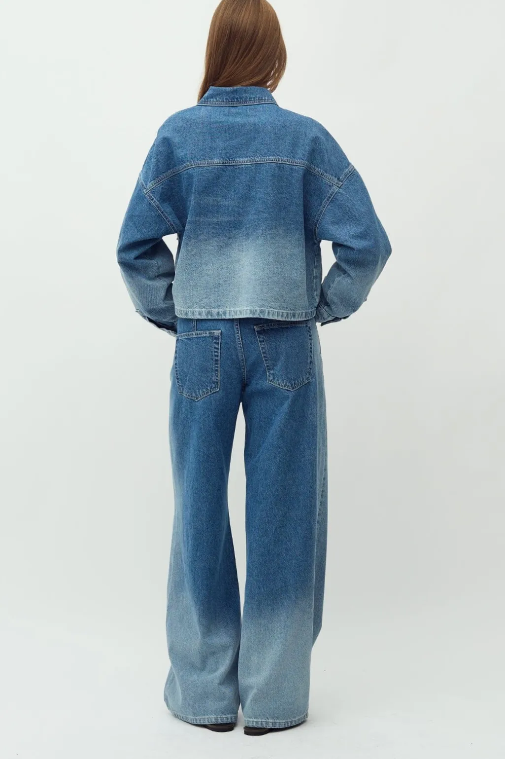 Denimjakke fra MbyM i en falmet denimvask. Jakken har skjortekrave, lange ærmer og knapper foran. To store lommer på forsiden giver jakken et klassisk denimlook.