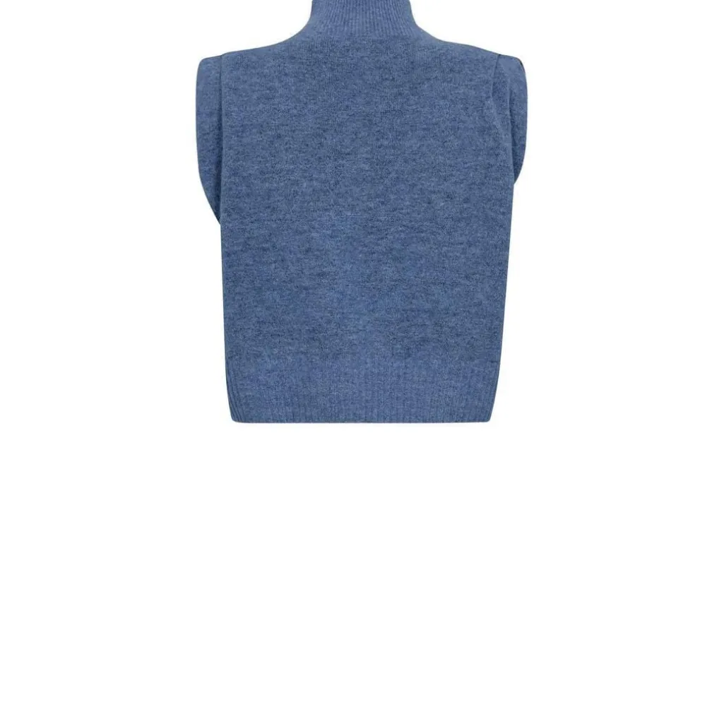 Ærmeløs top fra Gossia i Blue Melange, en meleret blå nuance. Toppen har en høj hals og et ribbet strik ved halsudskæringen og kanterne.