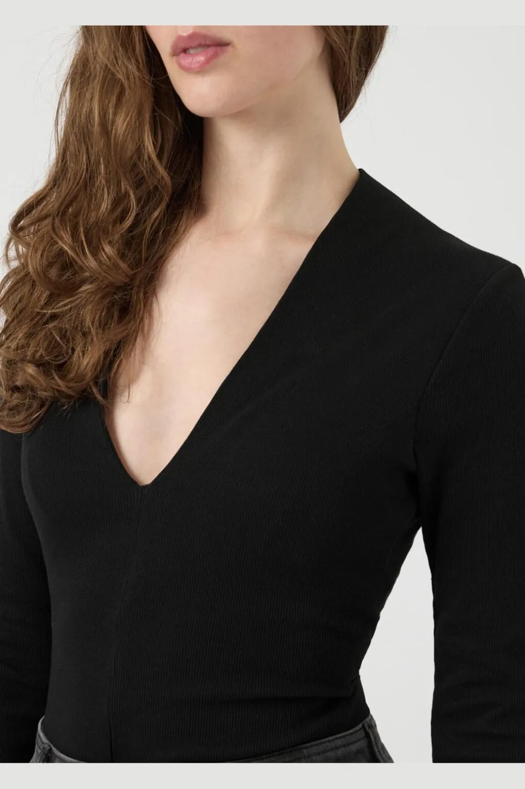Sort body fra Y. A.S i jerseymateriale med stræk. Den har lange ærmer og en dyb V-udskæring. Bodyen sidder tæt til kroppen og er lavet af blødt stof.