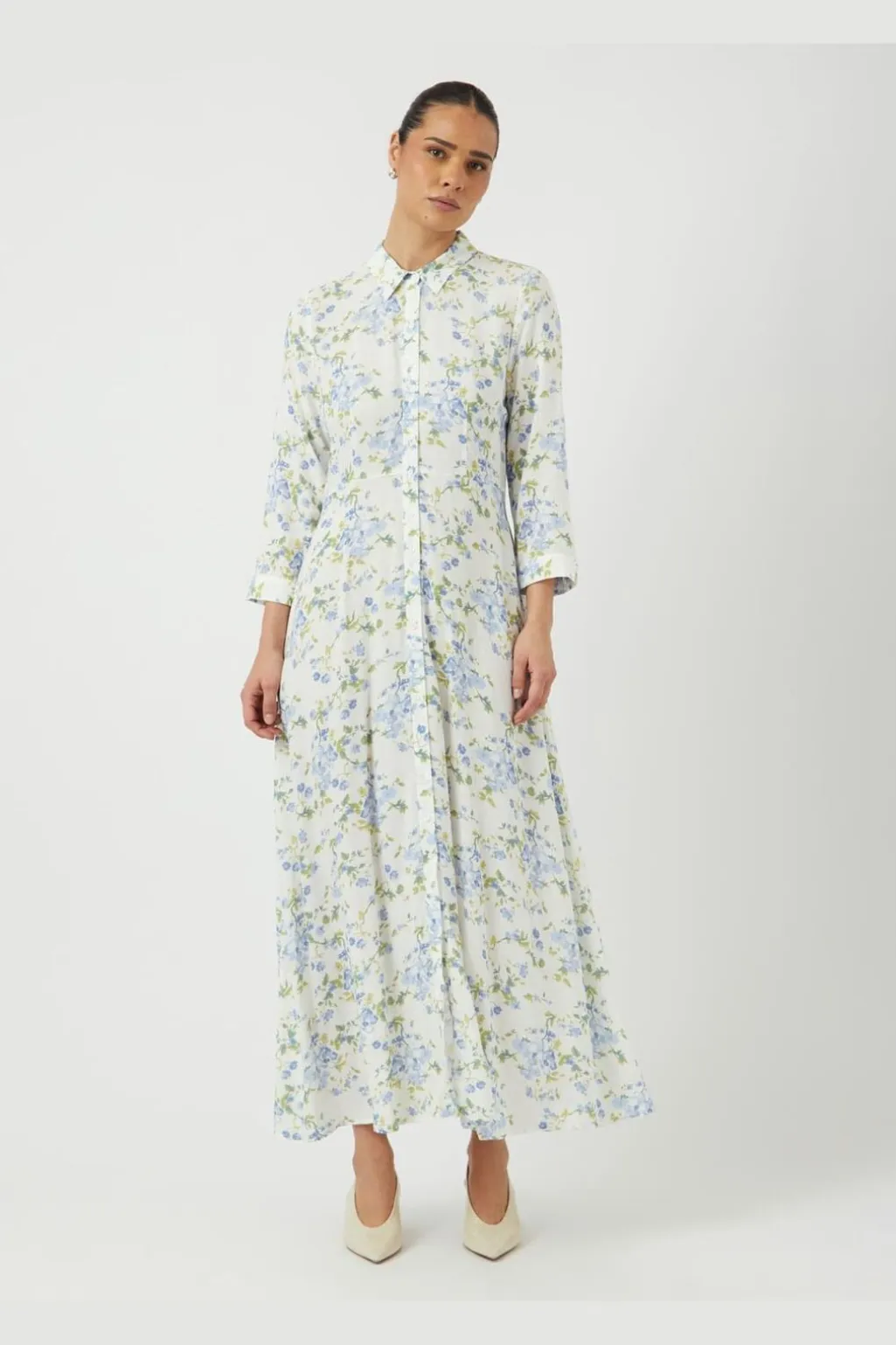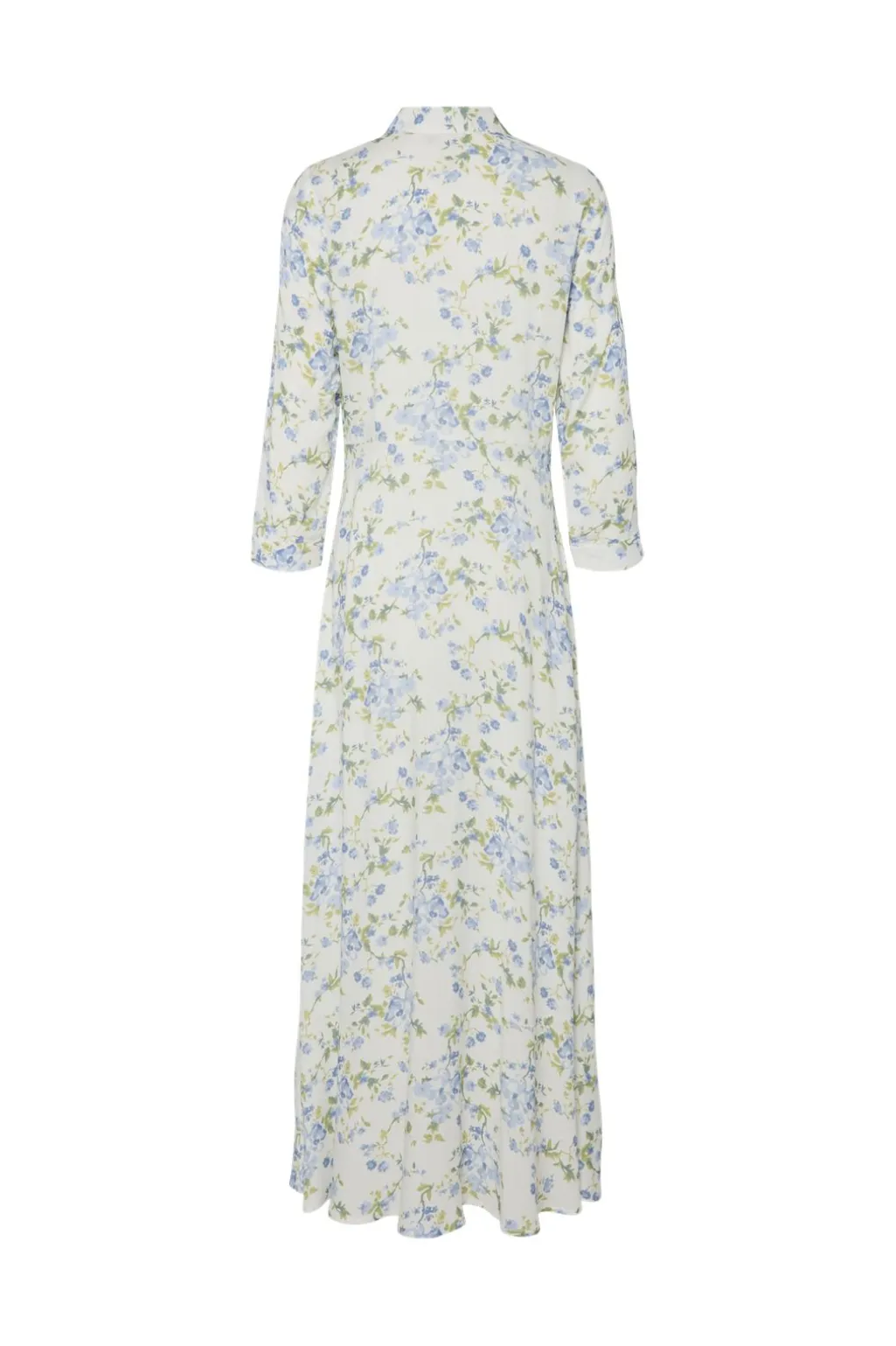 Lang skjortekjole fra Y. A.S med blomsterprint i blå og hvide nuancer. Kjolen har knaplukning hele vejen ned, V-halsudskæring og trekvartlange ærmer.