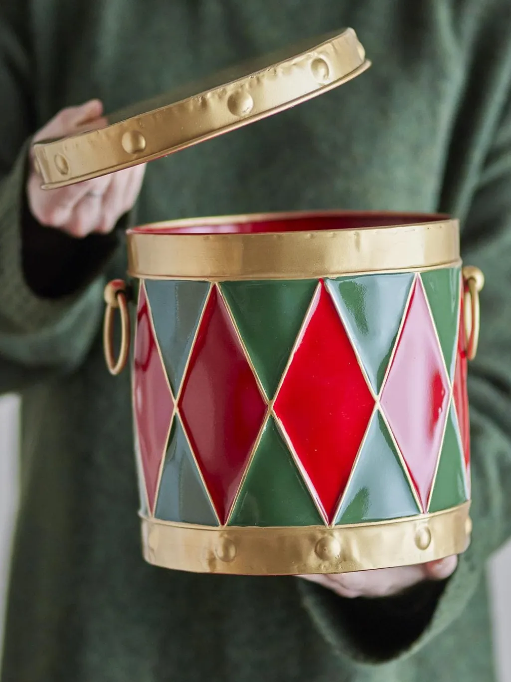 Trommeformet metalæske fra Bloomingville med rødt og grønt diamantmønster samt gulddetaljer. Sættet består af to æsker med aftagelige låg.