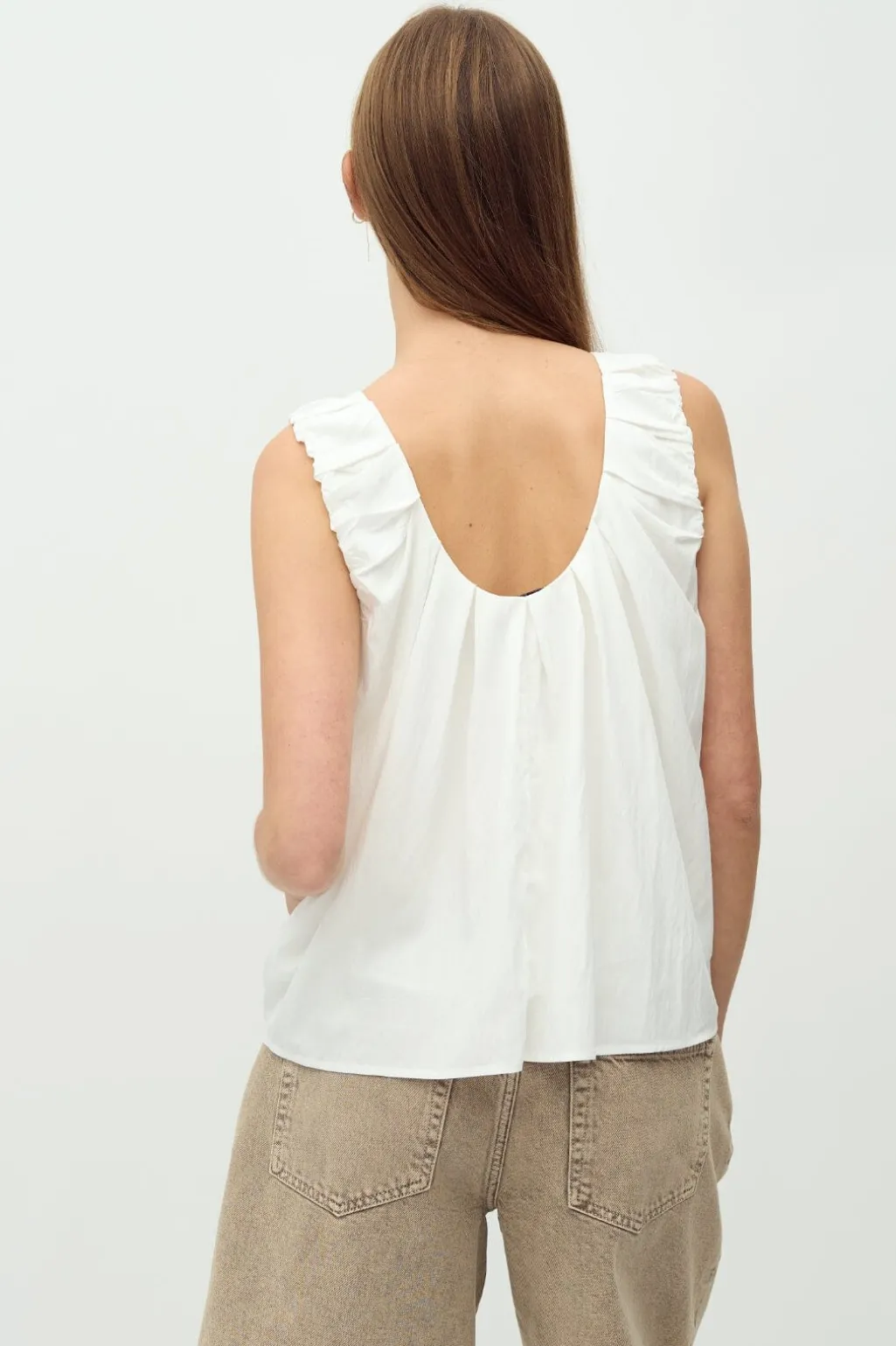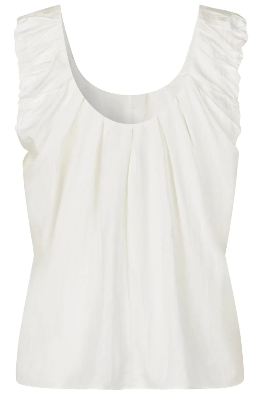 Hvid top fra MbyM med rynkede detaljer ved skuldrene og åben ryg. Toppen har en rund halsudskæring og en let struktur i stoffet.